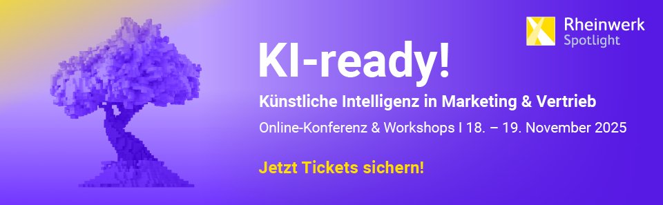 KI-Power für Marketing, Vertrieb und Kommunikation: Bei unser Online-Konferenz »KI-ready!« bekommen Content-Marketer, Social Media Manager*innen, SEO/SEA-Spezialisten und Sales Manager konkrete Lösungen zum Einsatz von Künstlicher Intelligenz in ihrem Arbeitsalltag. Tickets gibt es bereits ab 249 Euro: