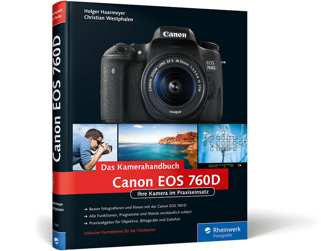 Mit diesem Buch lernen Sie Ihre neue EOS 760D von Grund auf kennen! Unsere Canon-Experten Holger Haarmeyer und Christian Westphalen erklären alle Funktionen und Menüs und zeigen Ihnen, wie Sie Ihre Kamera bei allen Ihren Fotoprojekten erfolgreich einsetzen. Die Autoren geben zahlreiche Tipps und sprechen auch Empfehlungen für Objektive, Blitzgeräte und Zubehör aus. Die Buchausgabe bietet zudem eine praktische Kurzreferenz für unterwegs!