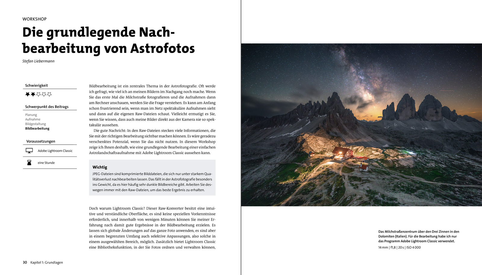 Anhand konkreter Projekte zeigen sie, wie auch Ihnen beeindruckende Aufnahmen gelingen. Lernen Sie die Grundlagen kennen, machen Sie sich mit der notwendigen Ausrüstung vertraut und lassen Sie sich von vielfältigen Bildideen inspirieren. Die Motive reichen von einfachen Astrolandschaften über Panoramen und Deep-Sky-Objekte bis hin zu Polarlichtern oder Mondfinsternissen. Ganz gleich, ob Sie neu im Kosmos der Astrofotografie sind oder sich schon etwas besser auskennen – unter den Workshops mit verschiedenen Schwierigkeitsstufen ist für jede und jeden etwas dabei.