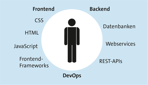 In den vergangenen Jahren hat sich die Berufsbezeichnung »Fullstack-Entwickler*in« immer mehr etabliert. Dabei geht es nicht darum, dass Sie in einem Webprojekt alles können muss. Es geht darum, einen Überblick über das Gesamtsystem einer Webapplikation zu haben und die Zusammenhänge zu verstehen. Das beginnt bei der Infrastruktur, auf der die Applikation ausgeführt wird, über die Organisation der Datenhaltung und des Backends der Applikation bis hin zur Umsetzung des Frontends. Ein Fullstack Developer ist dabei nicht nur mit einem sehr breiten, aber flachen Wissen ausgestattet, sondern kann sich in einem Thema spezialisieren. Wichtig ist, dass der erwähnte Blick für das Gesamtsystem nicht verloren geht.