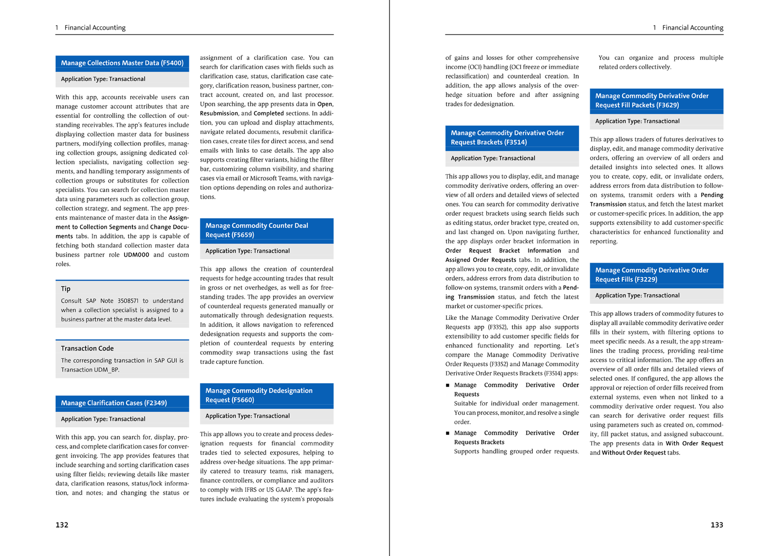 Flip through pages of apps organized alphabetically by functional area, or use the index to look up specific applications based on their name, type, SAP Fiori ID, or related transaction code.