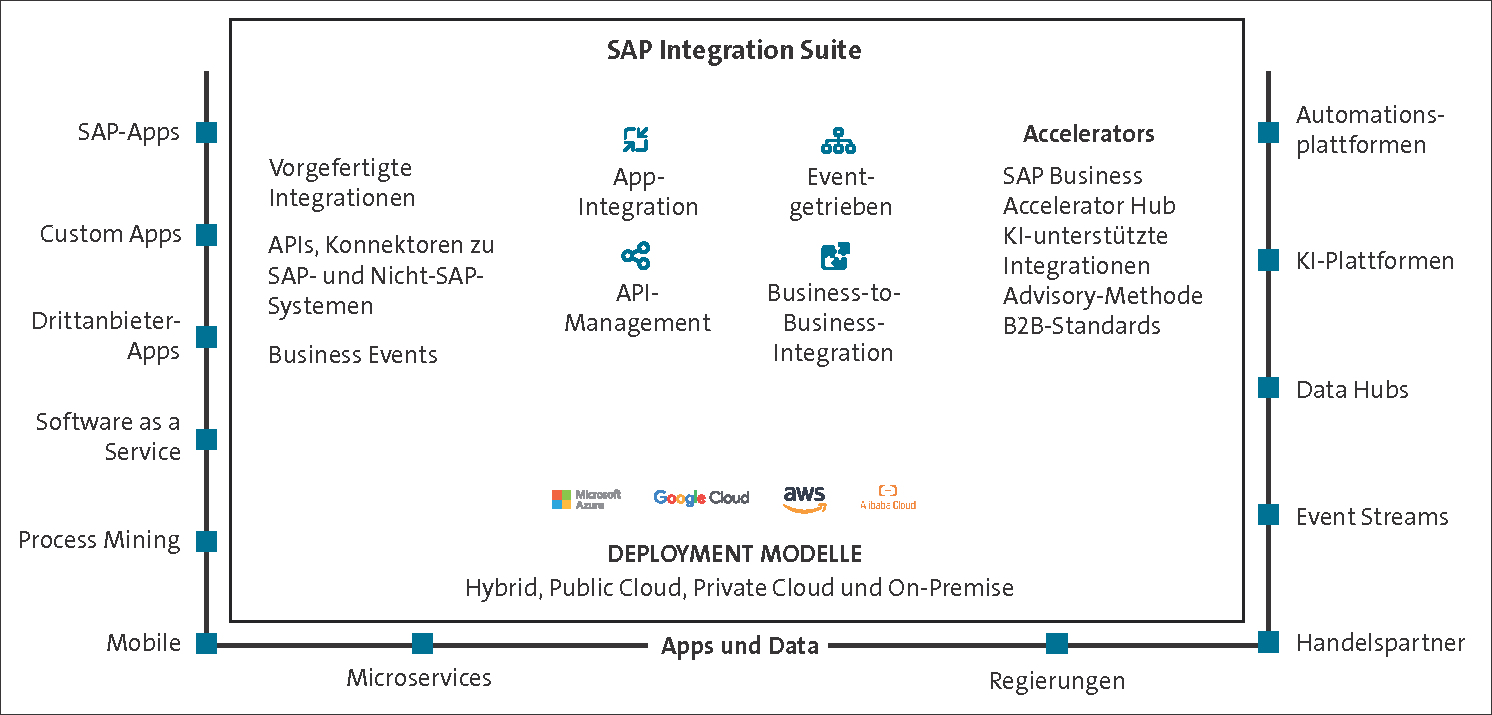Die SAP Integration Suite erleichtert als Middleware-Lösung, Verbindungsschicht zwischen verschiedenen IT-Systemen, die Kommunikation zwischen KI-gestützten Anwendungen und bestehenden IT-Systemen. Über standardisierte APIs und Konnektoren ermöglicht die SAP Integration Suite die Anbindung von KI-Diensten an: