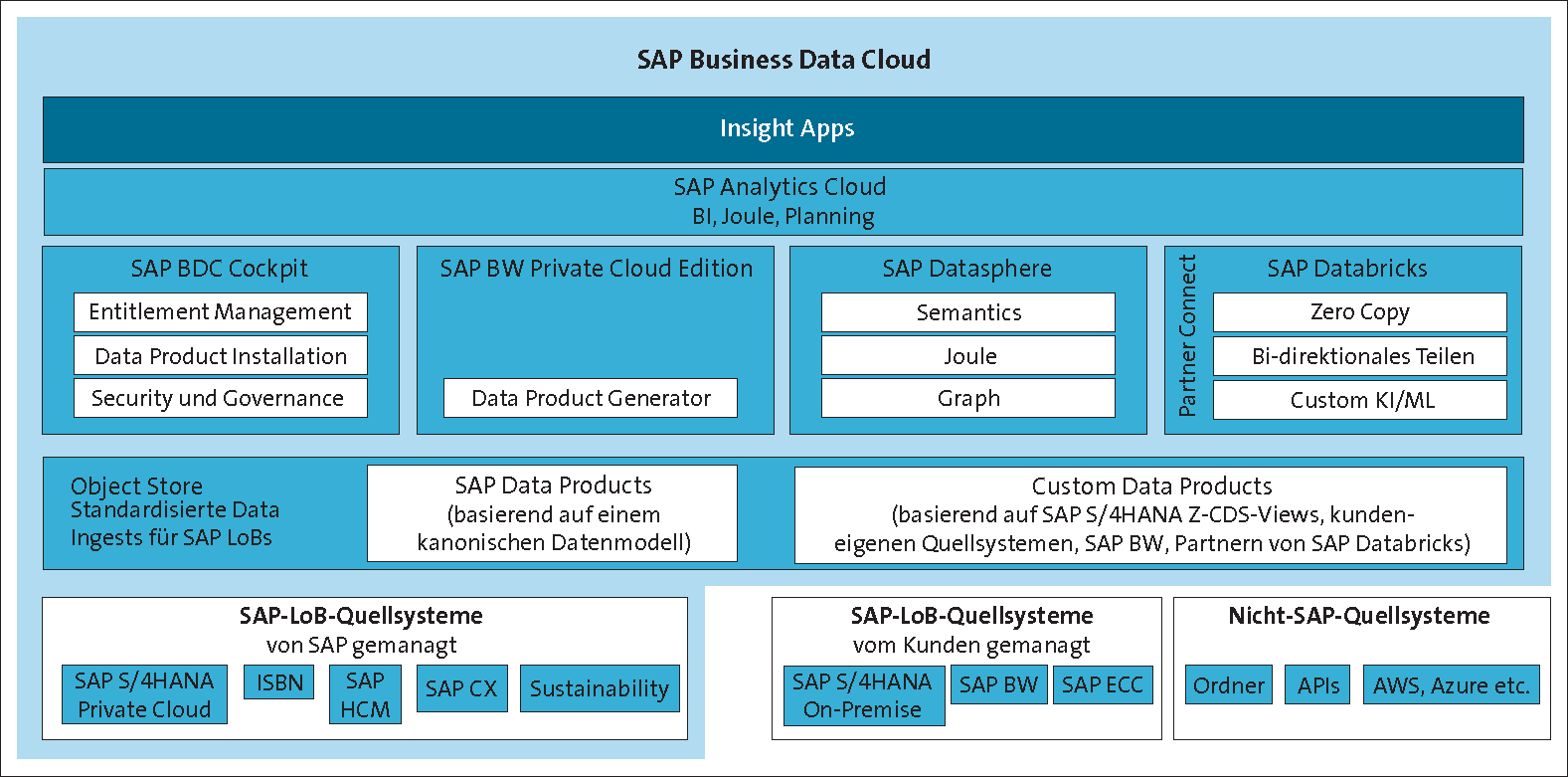 Für die Datenintegration stellt SAP die SAP Business Data Cloud als Plattform bereit, die Unternehmen dabei hilft, Daten aus verschiedenen Quellen zu verarbeiten, zu harmonisieren und für KI-Modelle nutzbar zu machen. Die SAP Business Data Cloud fungiert als Single Point of Entry: Sie vereint SAP Datasphere, SAP Analytics Cloud, SAP Databricks und weitere Dataprodukte in einem zentralen Cockpit.