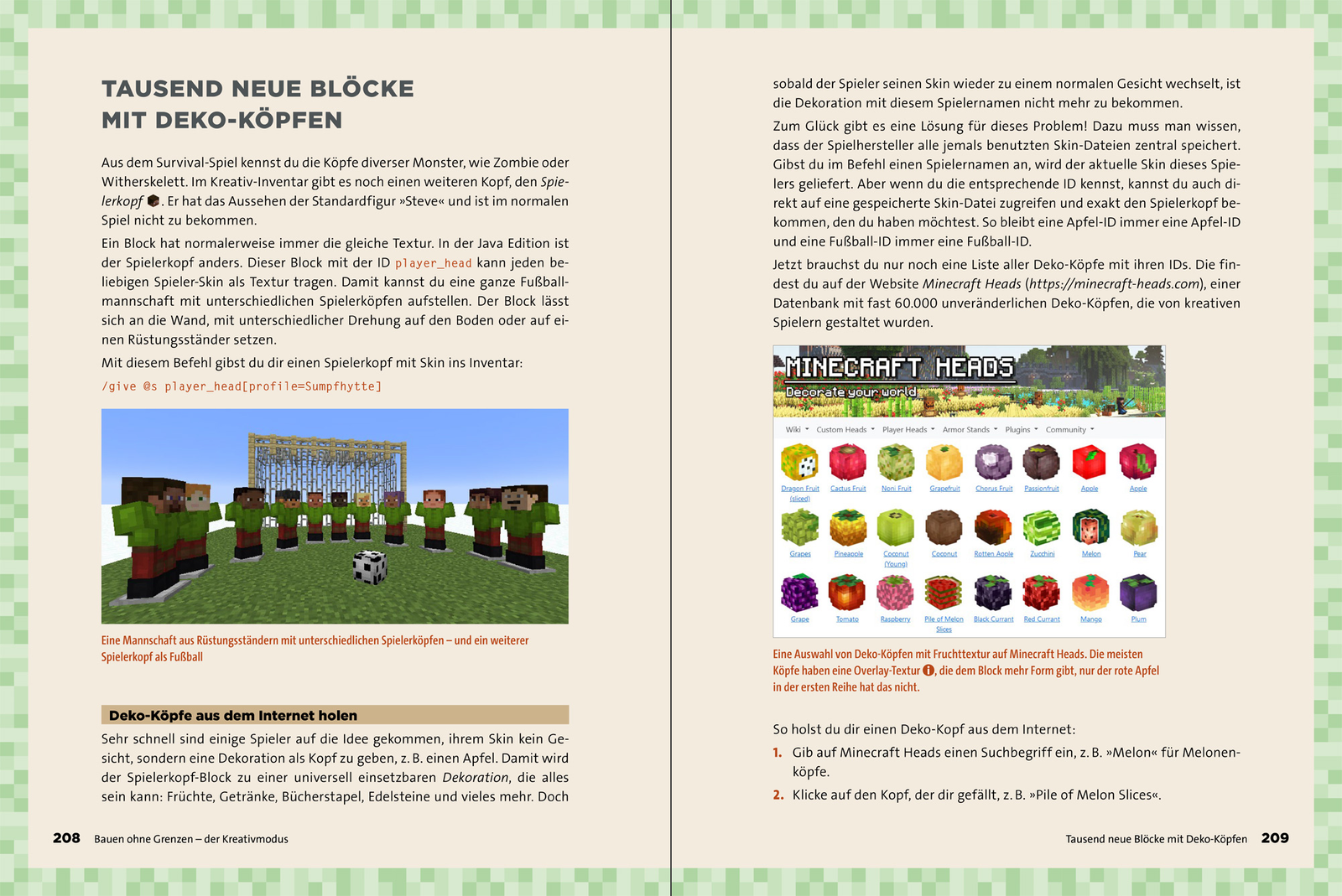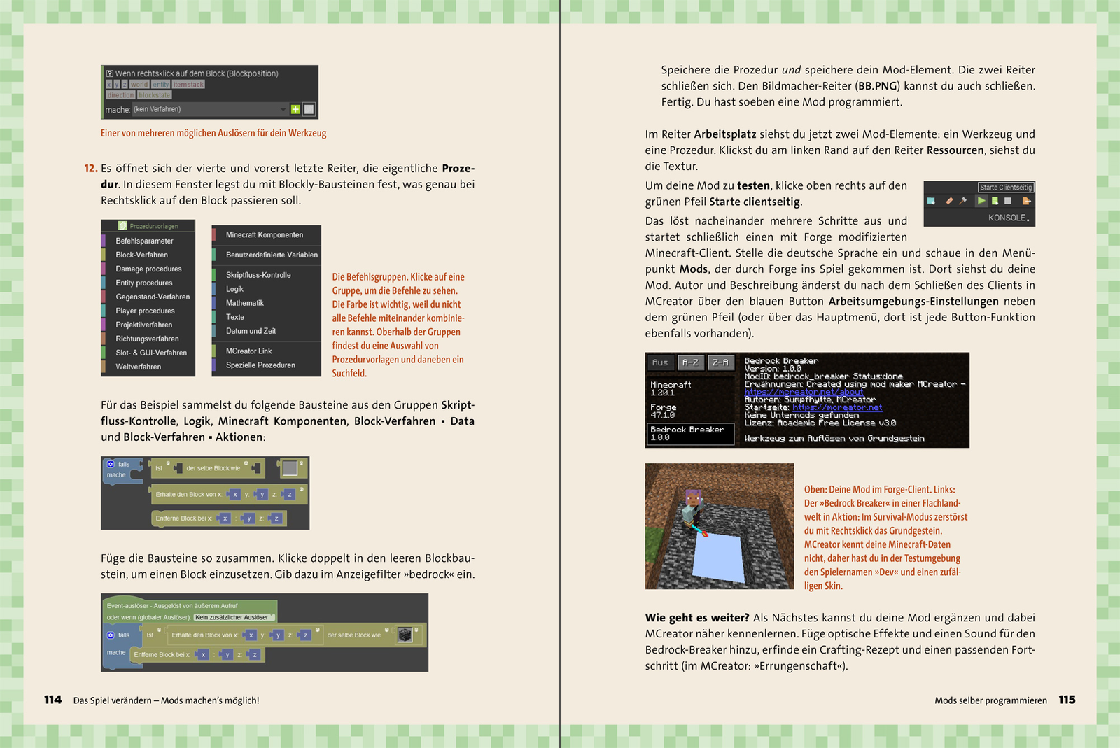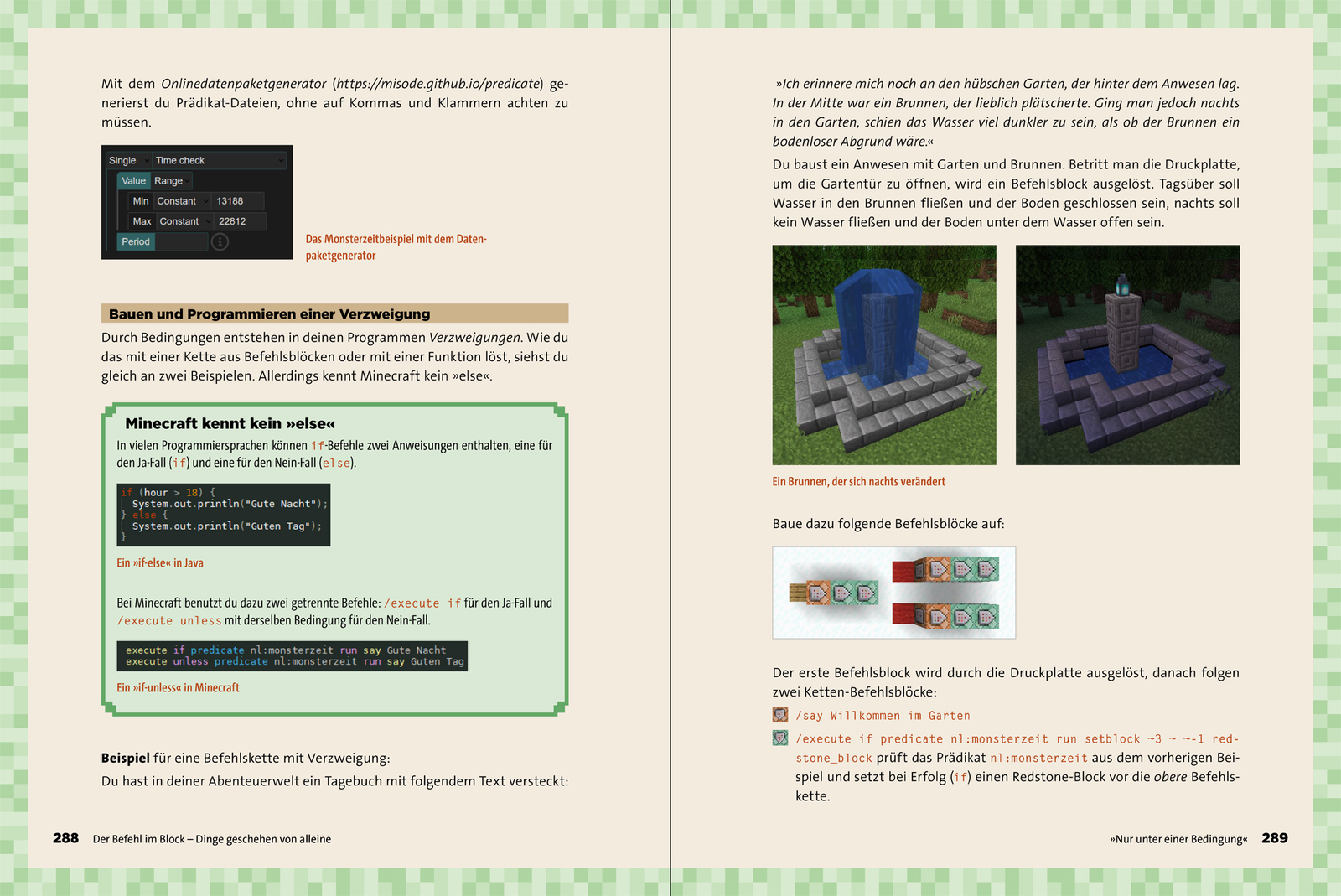 Mit den Minecraft-Befehlen entpuppt sich das Spiel als riesiger Kreativbaukasten. Manipuliere Blöcke, Gegenstände und Kreaturen, verbiege ihre Eigenschaften und lasse sie nach Belieben erscheinen und verschwinden. Von Einsteiger-Befehlen, die Zeit und Wetter ändern, bis zu komplexen Experten-Befehlen ist alles abgedeckt und wird Schritt für Schritt mit vielen Beispielen erklärt.